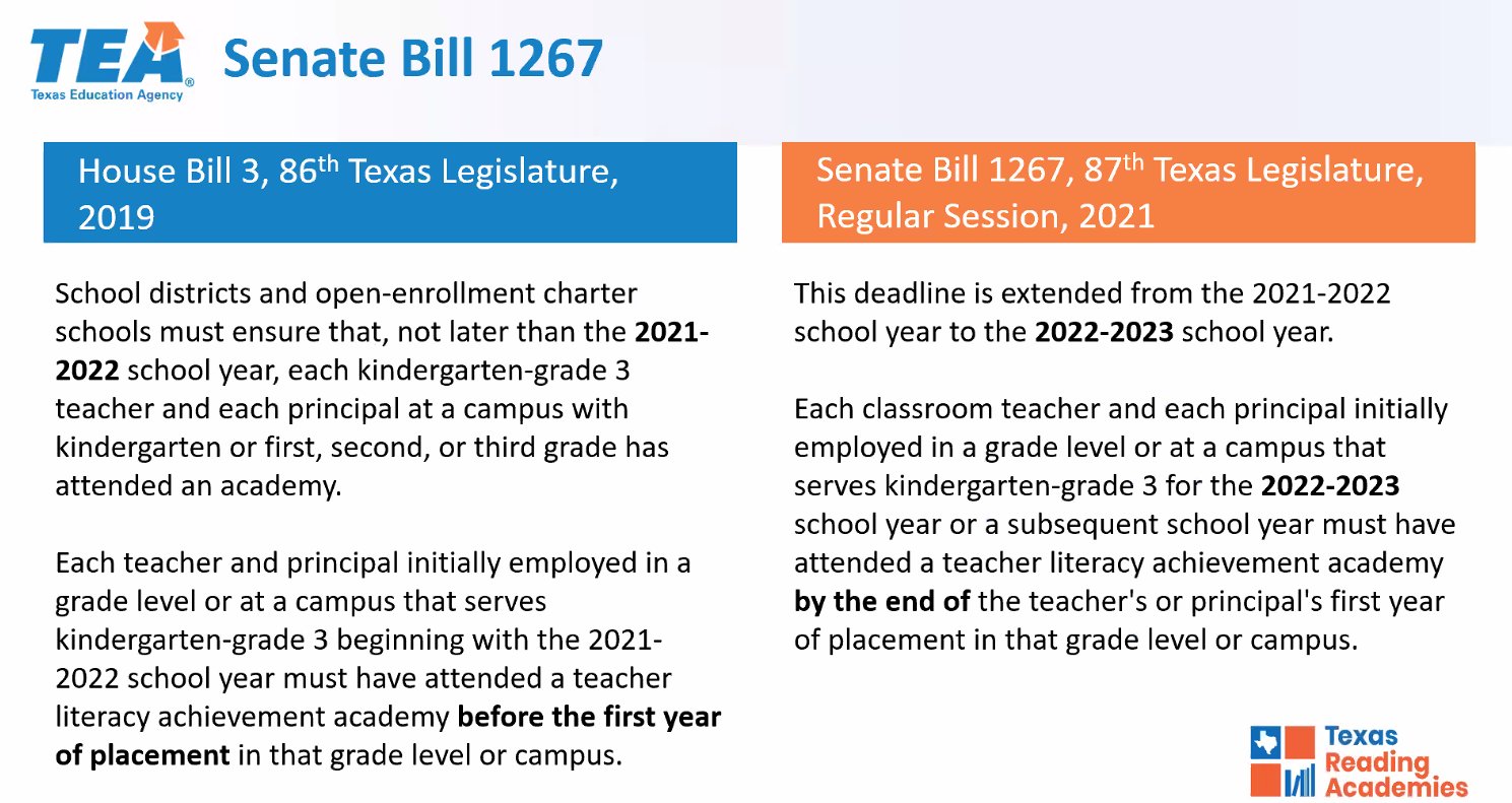 HB 3 requires all teachers and principals in grades K 3 to demonstrate proficiency in the Science of Teaching Reading through successful completion of Reading Academies by the. Year 3 implementation changes including an expanded list of K-3 teachers who can be exempt or partially exempt from the academies. Texas Reading Academies are intentionally designed to provide choice in implementation to meet local needs and priorities.